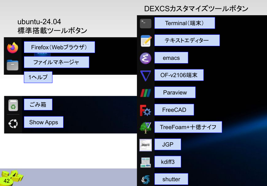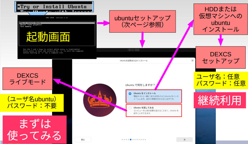 - DEXCS2024以降、ネットワーク接続した状態でubuntuをインストールすると、カーネルのアップデートが不完全のまま再起動しようとして、マシンが正常に起動できなくなり、その補完作業(インストール方法の12〜16ページ)が必要になります。