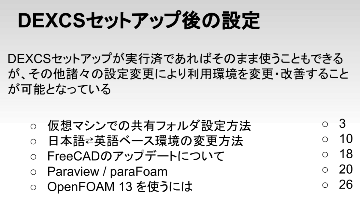 またDEXCS2024における同梱資料を解説書「はじめてのDEXCS for OpenFOAM」の内容とほぼ同一になるよう構成したのと同様、DEXCS2025における同梱資料も、最新刊「DEXCS2024 for OpenFOAMのトリセツ」の内容とほぼ同一になるよう構成した。