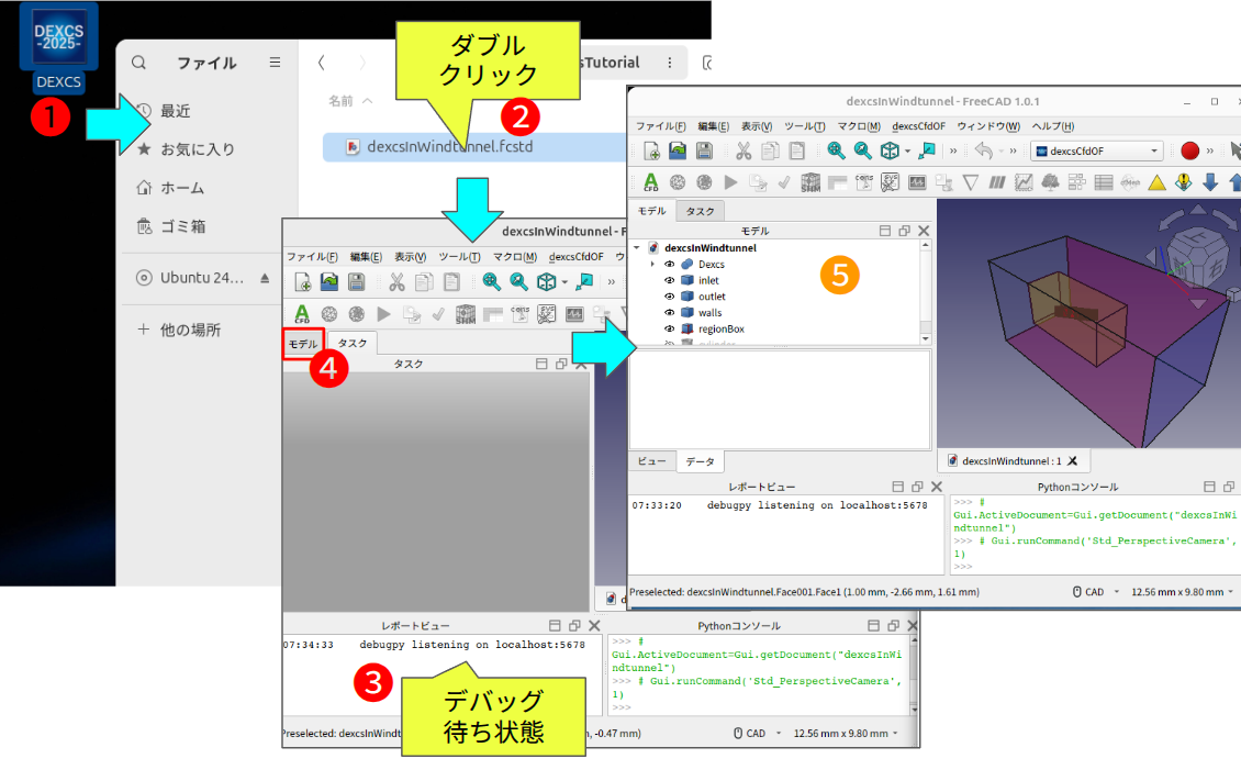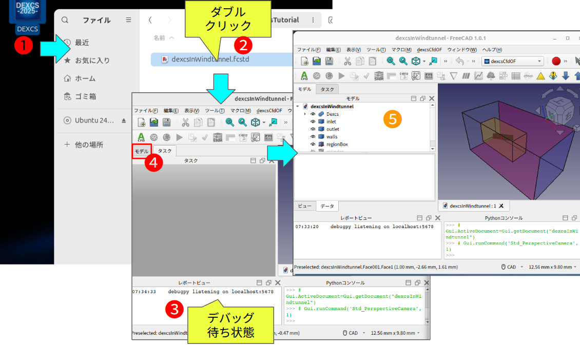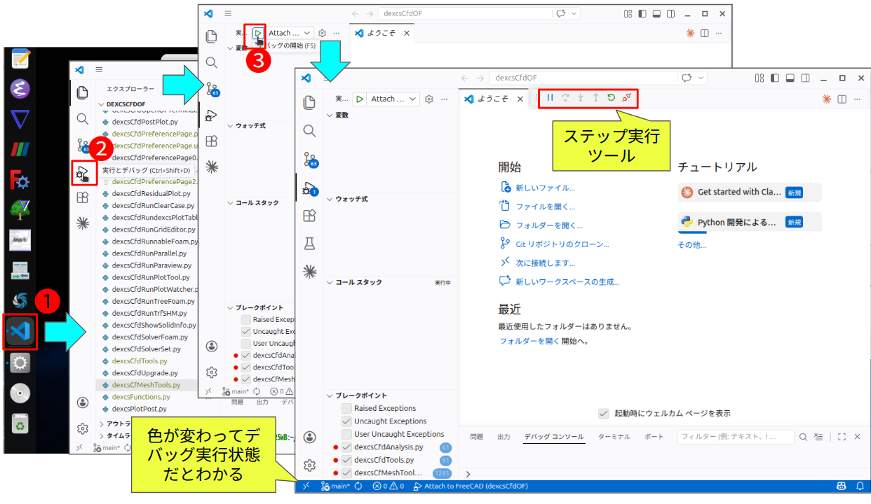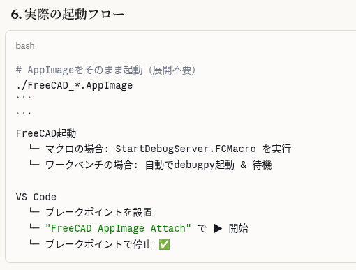 当初は、FreeCADのAppImage版を展開したプログラムで起動してデバッグする方法として使えるようになったので、一旦はその方針(下図)でまとめる予定でいた。