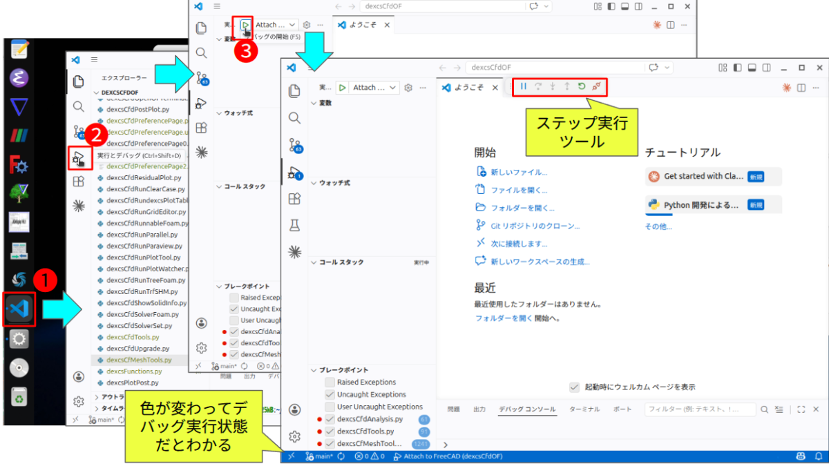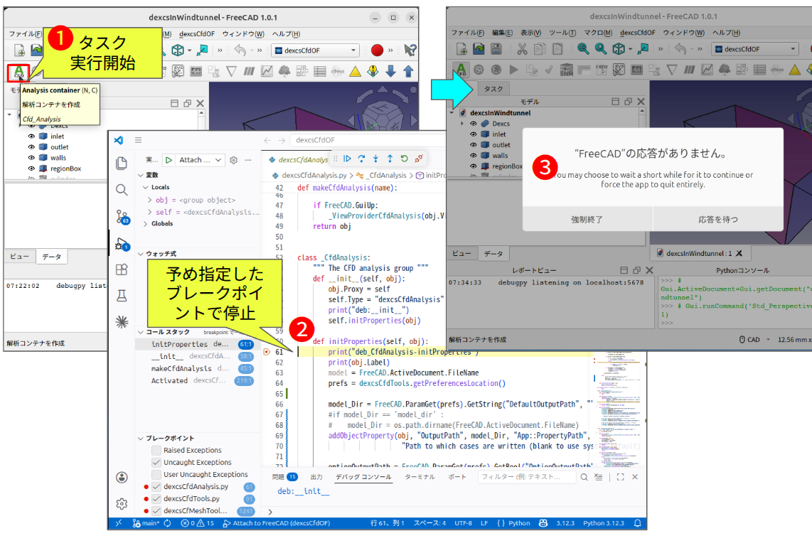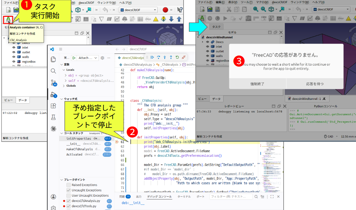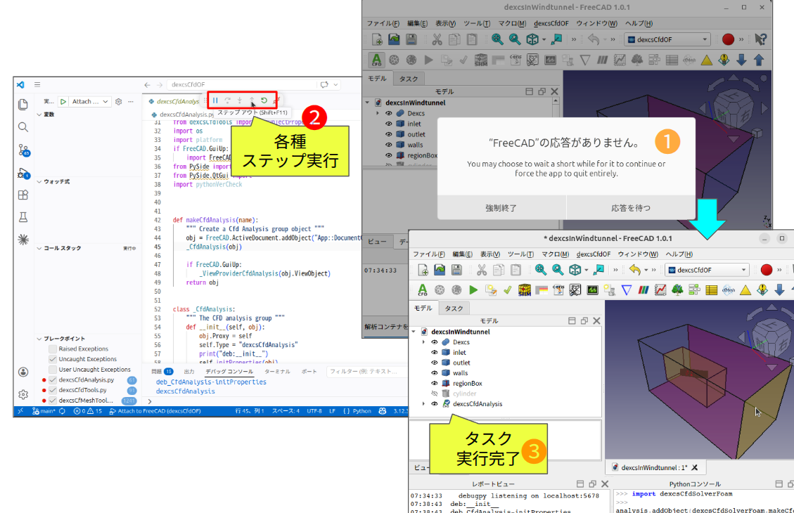 プログラムの改変編集には数年前からvs code を使ってきており、それなりに重宝させてもらってきていたが、FreeCADの内蔵pythonで動くという特殊な環境で使うものであるので、vs code上でステップ実行させるなど、デバッガーとして使うことはできていなかった。