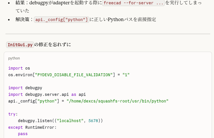 - debugpyは ~/.freecad-debugpy に –target インストール