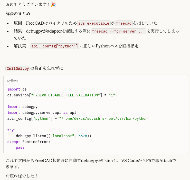 しかしながら本記事として取り纏めるに際して、要点を整理して改めてcladeに聞き直したところ、デバッガーだけをローカルインストールして、FreeCAD本体は通常のAppImage版を起動する方法が提案された(下図)。