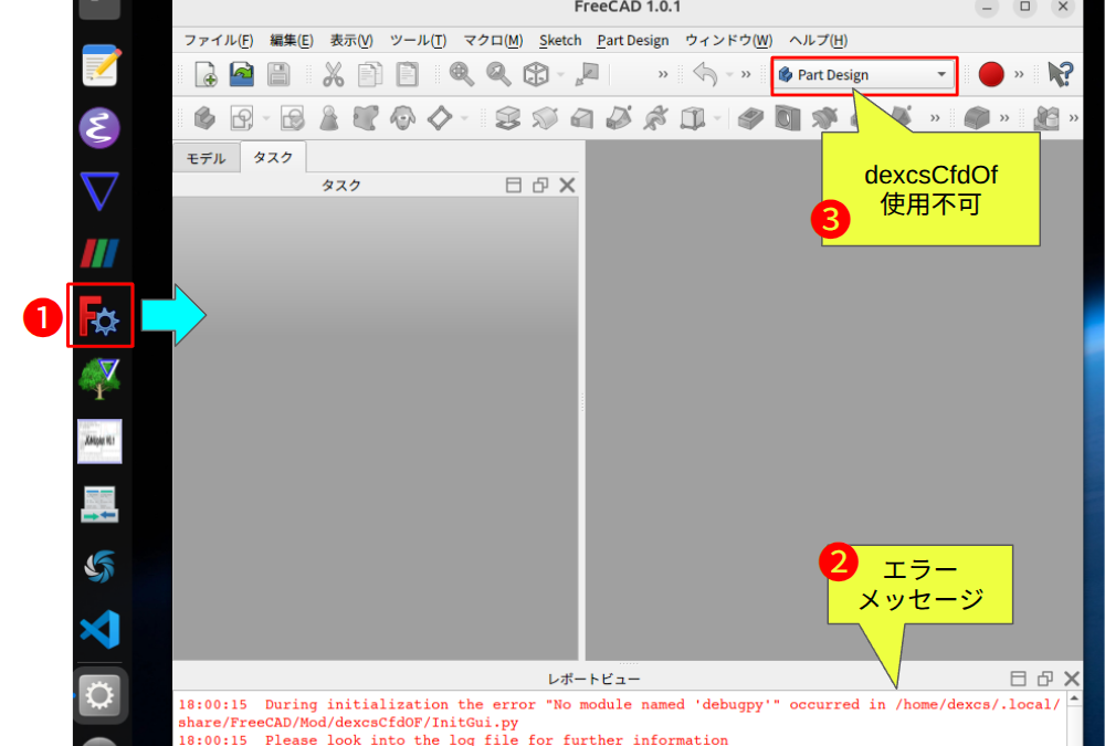 当初の方法(展開したプログラムから起動する方法)で、DEXCSワークベンチのinitGUI.pyを改変してしまうと、通常のAppImage版で起動した際に、DEXCSワークベンチをロードできなくなってしまっていた(下図)。