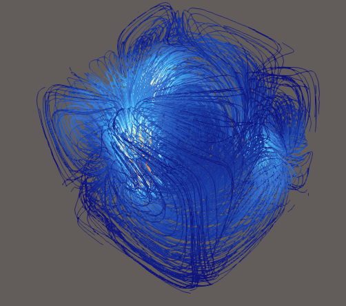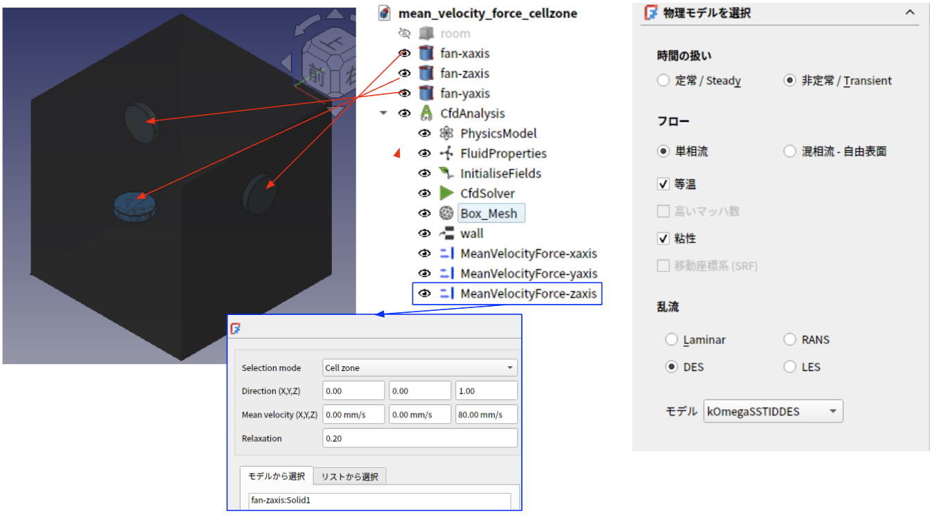 立方体ブロック中に各々方向と風速の異なる3つのファンブロックが存在することによる複雑な流れを計算している。ファンブロックは従前バージョンにはなかったツールボタン(下図参照)