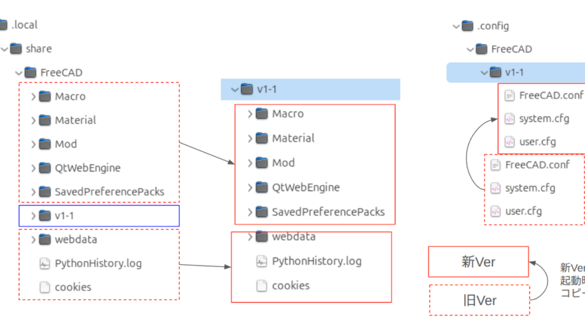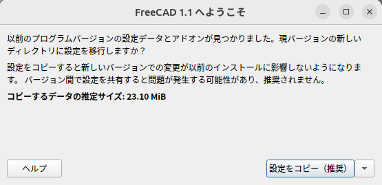 何やらよくわからなかったが、「設定をコピー(推奨)」を選択した。後で調べてわかったのは、FreeCADの諸々設定ファイルは、ホームフォルダ下の.local/share.FreeCADフォルダと、.config/FreeCADフォルダに収納されているが、今回からはそれらの下にバージョン名フォルダ(v1-1)を作成して、その中に収納するようにし、バージョンによって異なる設定ファイルを使うことができるということのようだ。