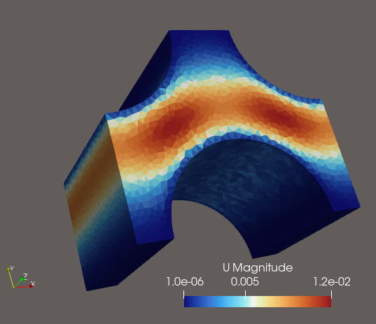 従前から存在したチュートリアルケースのViscousTubeBundleにおいて、流れの主要部だけに着目して周期境界条件で計算したもの(多分)。
