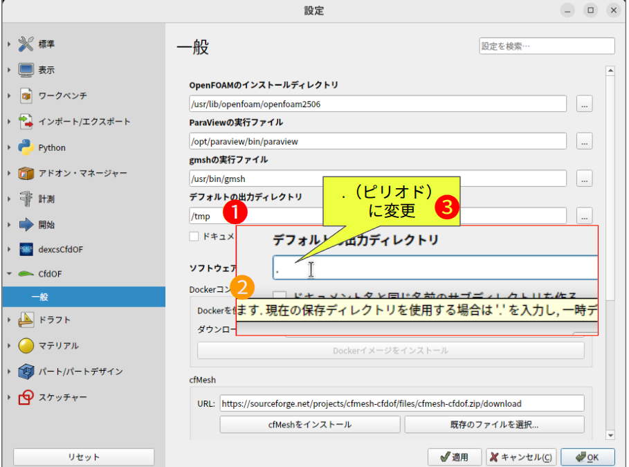 デフォルトの出力ディレクトリが/tmp となっている。しかし、マウスカーソルを当てて表示される吹き出し❷をよく読むと、「現在のディレクトリを使用する場合は”.”を入力し…とあったので、❸.(ピリオド)に変更した。