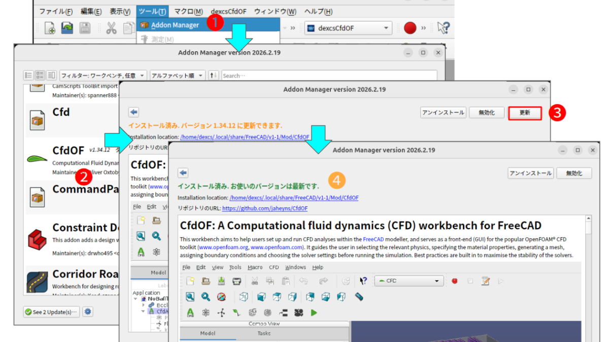 • DEXCS2025において、FreeCAD最新版(ver 1.1)とCfdOFの最新版(V1.34.12)に更新する方法について取り纏めた。