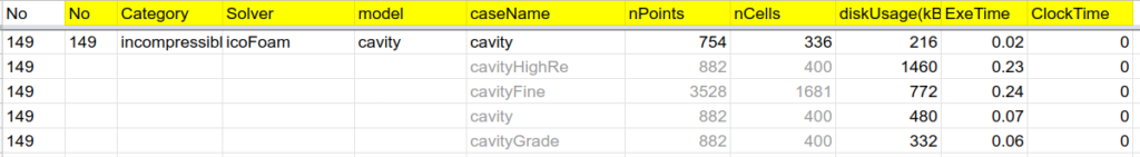 ログ解析ツール(allFiles.py)では、単純に全ディレクトリへ移動してOpenFOAMのケースファイルであるかどうかを調べているだけなので、上記例の場合、cavityフォルダ下に5つのケースファイルが存在する事となり、それぞれ個別ケースとしてカウントされてしまう。