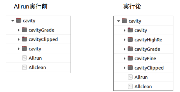 さらに問題を厄介にしているのは、チュートリアルケースの実行前後で、フォルダー構成が大きく変化してしまうケースがあることである。古くから存在する incompressible/icoFoam/cavity のケースを例に説明する。