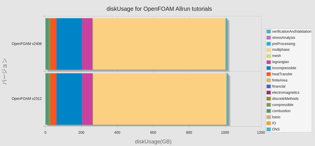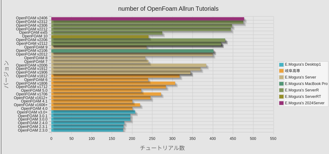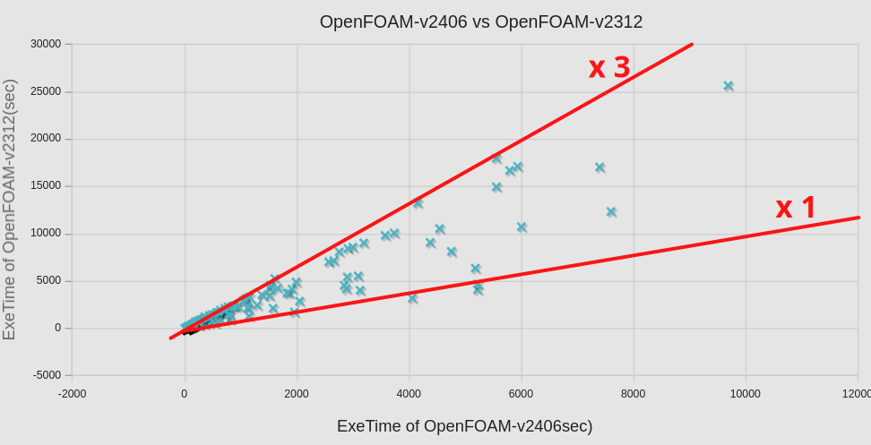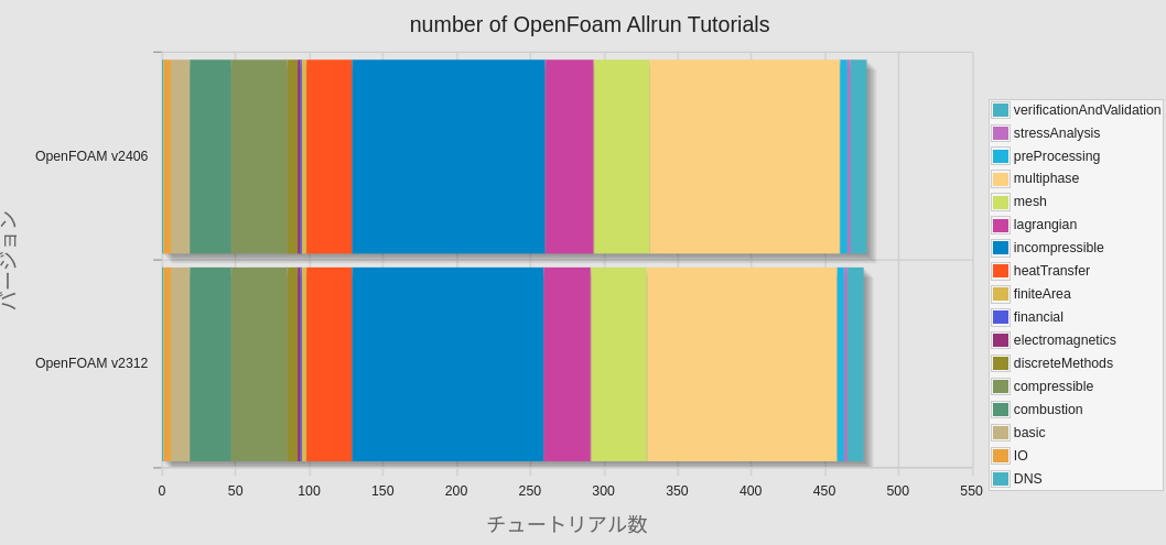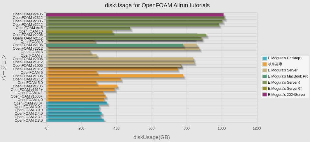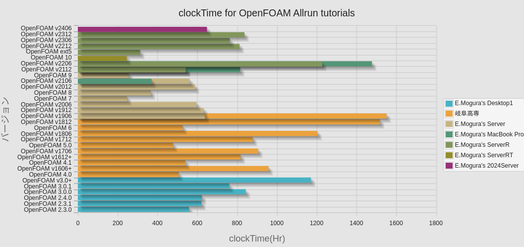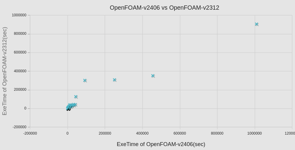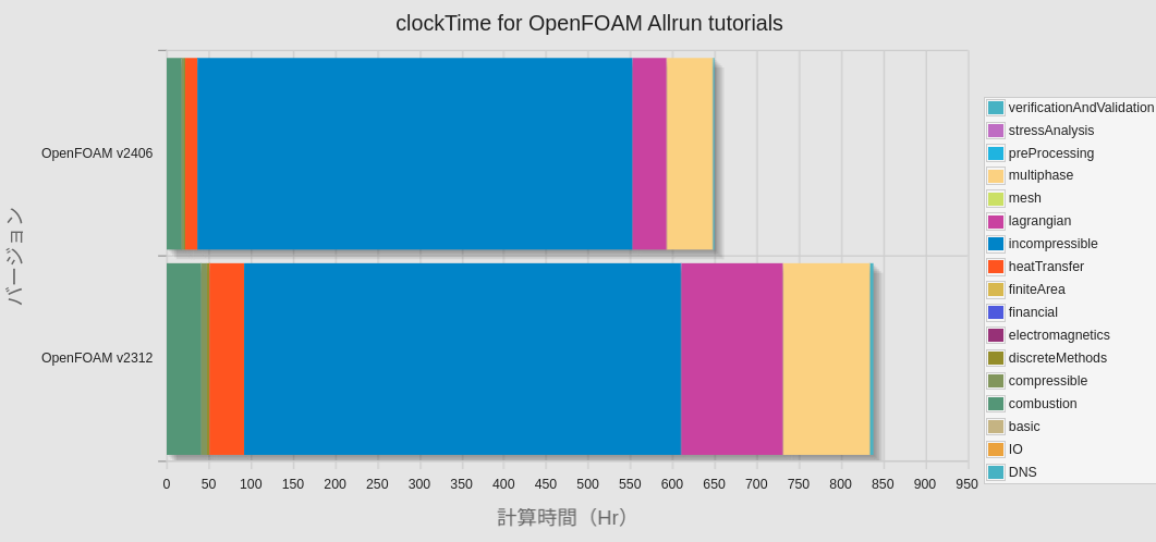 OpenFOAM-v2406のAllrunの結果を公開した。総ケース数478(476)、使用ディスク容量:1016GB(約1TB)、総計算時間:約27日(35日)であった。かっこ()内数字はv2312のもの。