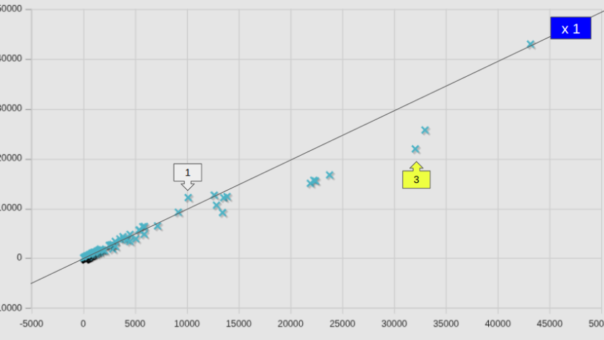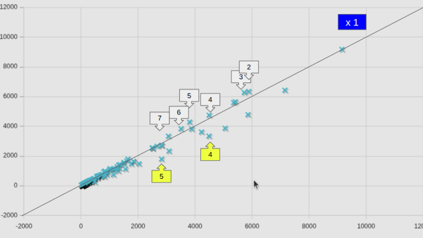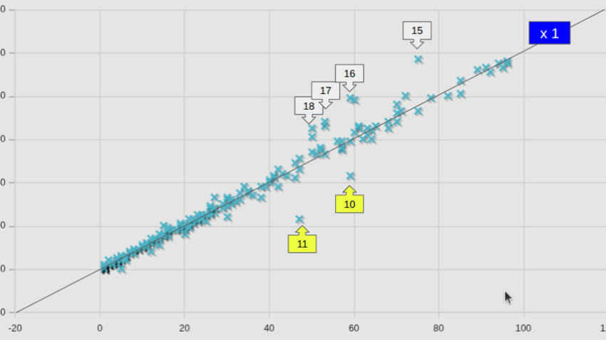 また、計算時間の増加したケースのリスト中、15番以降は、adjoiintOptimizationFoamソルバーを使ったケースであり、図を見ると抽出した番号の近くには、他にも多くのケースのあることがわかる。これらもやはり同一ソルバーのケースであった。