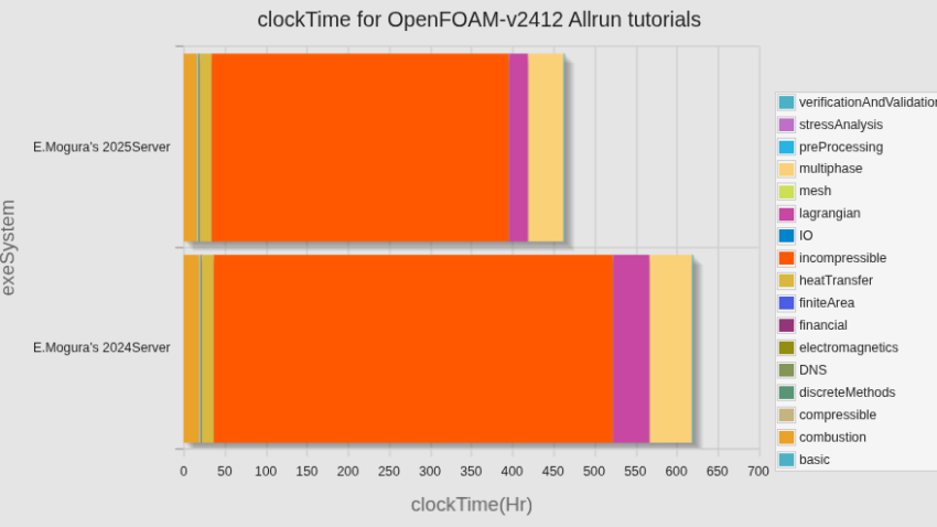 先の記事はOpenFOAM-v2406を題材に、新サーバー(E.Mogura’s 2024 Server / Intel Core i9-14900K)と、新々サーバー(E.Mogura’s 2025 Server / AMD Ryzen 9 9950X)の比較であったが、本記事ではOpenFOAM-v2412を題材にしたものである。