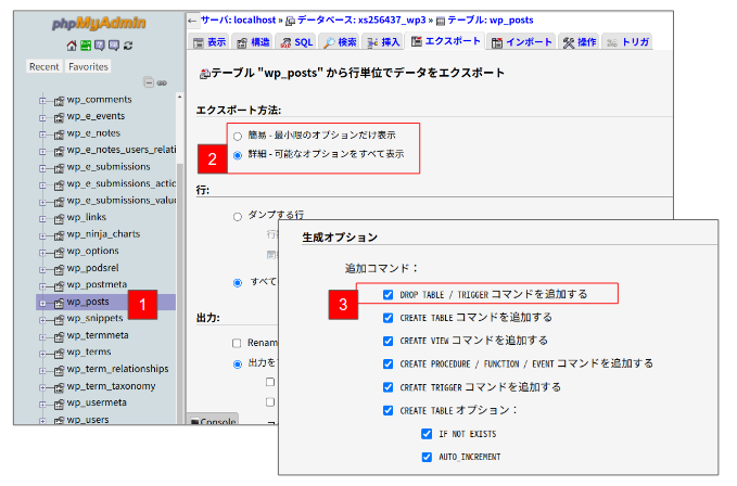という3つのSQLファイルが作成されるので、これらをphpMyAdminを使ってインポートして、エラーが生じなければ作業が完了となる。